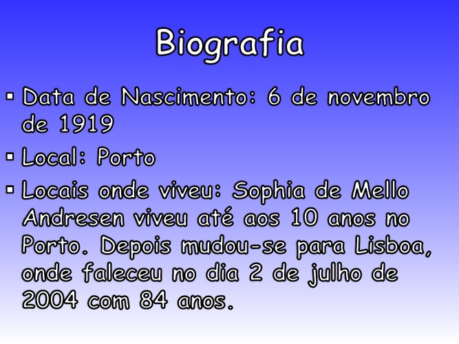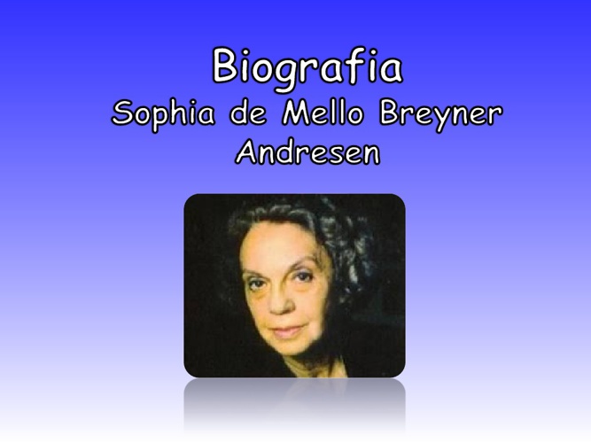 Sophia de mello breyner andresen nasceu a 6 de novembro 1919 no porto onde passou a infancia. A sua infancia e adolescencia passaram se entre o porto e lisboa onde frequentou o curso de filologia classica. Foi a primeira mulher portuguesa a receber o mais importante galardao literario da lingua portuguesa o premio camoes em 1999.