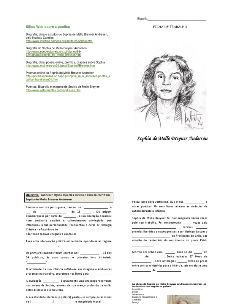 Sophia de mello breyner andresen 1 gcolse gcih porto 6 de novembro de 1919 lisboa 2 de julho de 2004 foi uma das mais importantes poetisas portuguesas do seculo xx. Apos o casamento com o advogado francisco de sousa tavares fixa se em lisboa passando a dividir a sua actividade entre a poesia e a intervencao civica contra a. Publica os primeiros versos em 1940 nos cadernos de poesia.