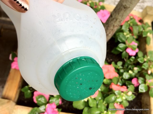 Since we only have one planter, a small flower bed, and three hanging baskets to keep watered, I didn't really want to have to get a watering can. (Read: I forgot to buy a watering can when we got the hanging baskets and am not arsed to traipse to Homebase for one. Also, I really don't want to have to lug a watering can home on the bus.)