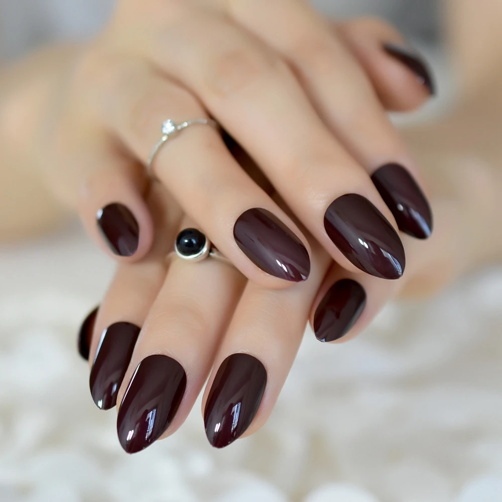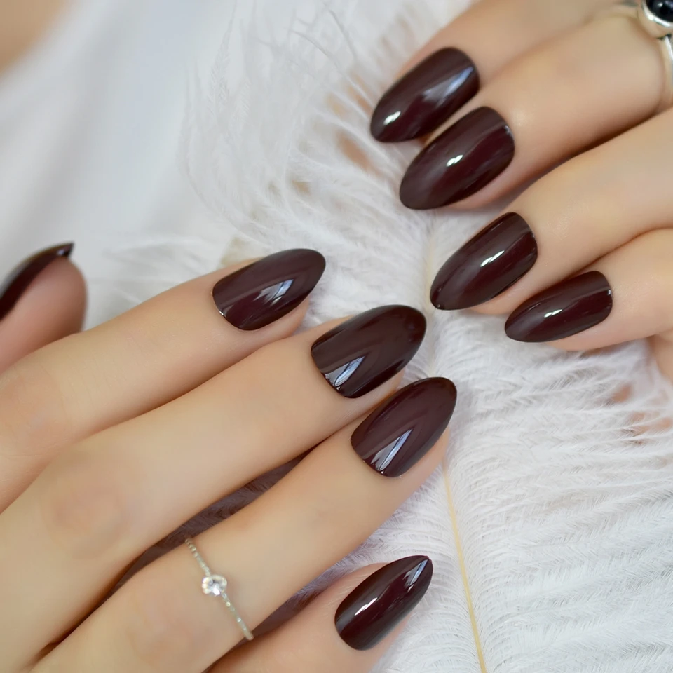 False Nails Short Oval Sharp Solid Dark Brown Fake Nails Stiletto